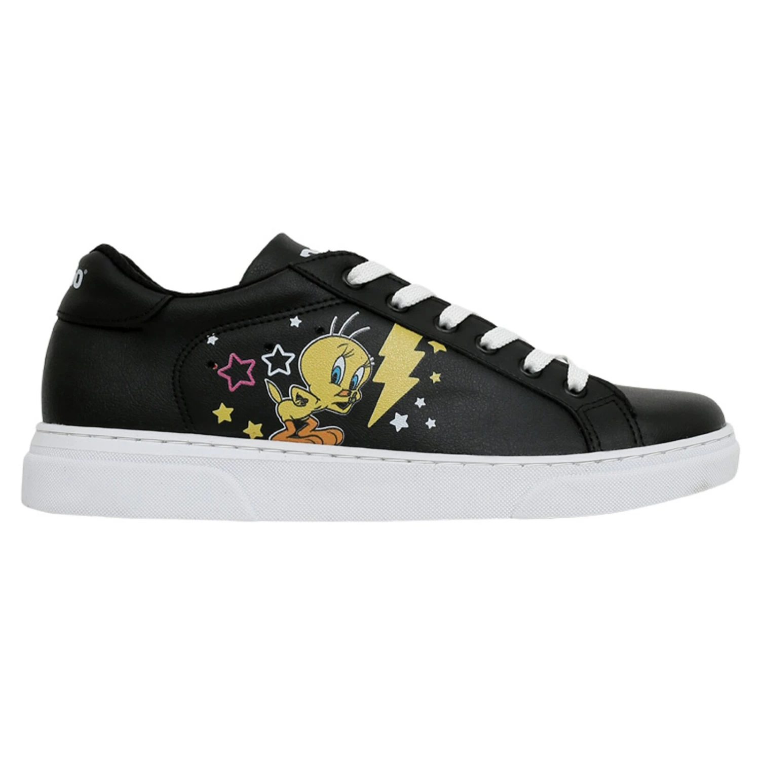 Die Black Edition der beliebten Ace Sneaker ist perfekt für alle, die es nicht ganz so clean, aber dennoch zeitlos und modern zugleich mögen. Ebenso wie die weiße Variante der Ace Sneaker garantiert auch die Black Edition hohen Tragekomfort und zahlreiche Kombinationsmöglichkeiten. Die weiße Sohle und die weißen Schnürsenkel schaffen einen gekonnten Kontrast zum Schwarz der Schuhoberfläche. Die einzigartigen Motive sind dezent auf den schwarzen veganen Sneakern platziert. So entsteht eine perfekte Balance aus Trend und Individualität. Das Design „Best of Tweety and Sylvester“ zeigt die beliebten Trickfilm-Charaktere, die weltweit unzählige Fans haben. Auf dem schwarzen Obermaterial, das zu 100 % aus veganen Materialien besteht, stechen diese beiden Figuren besonders gut ins Auge und ziehen definitiv alle Blicke auf sich.