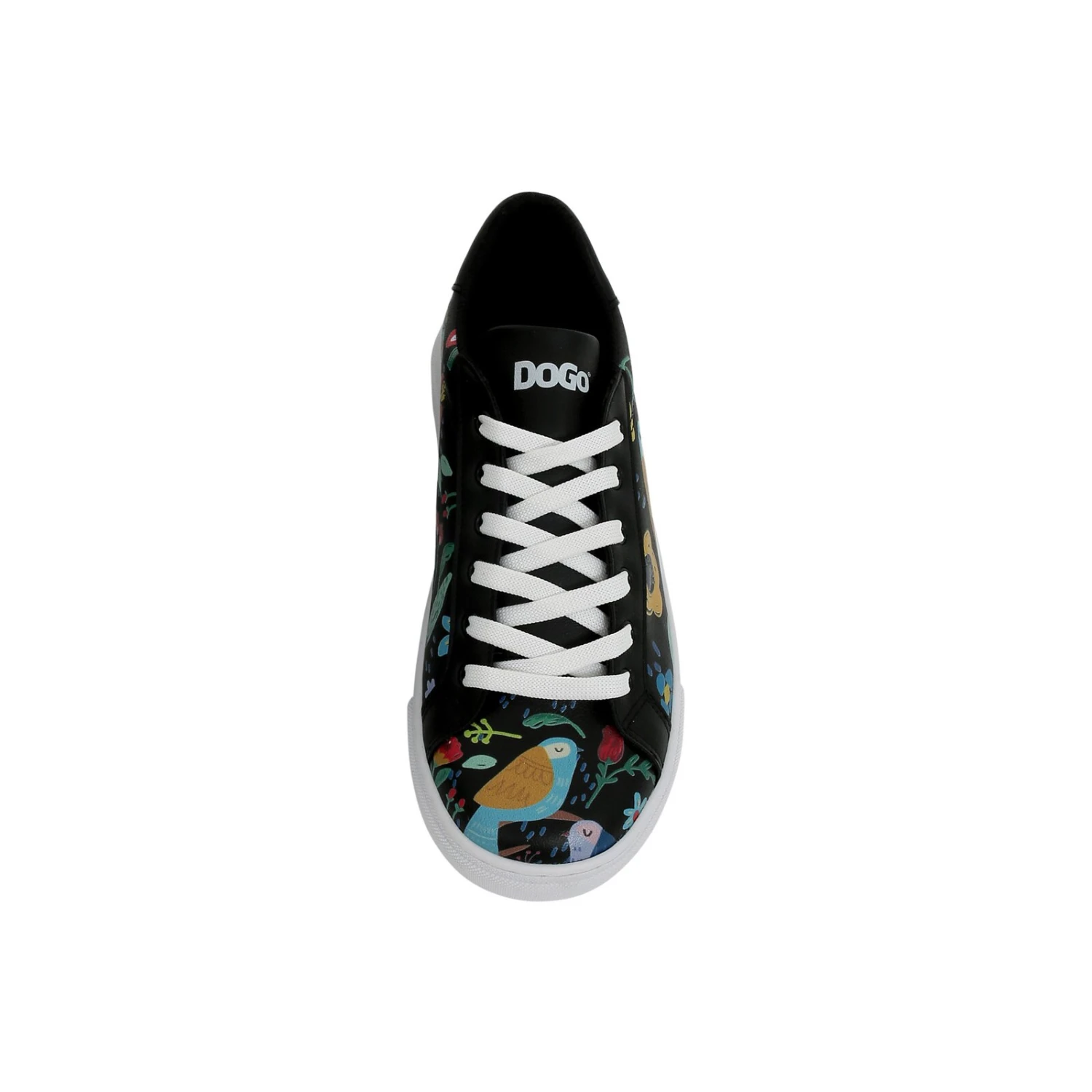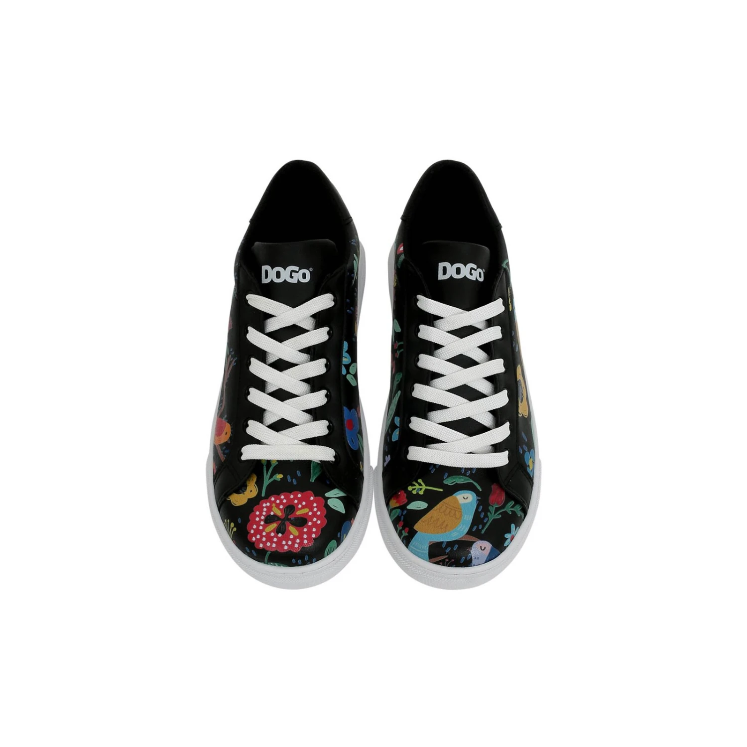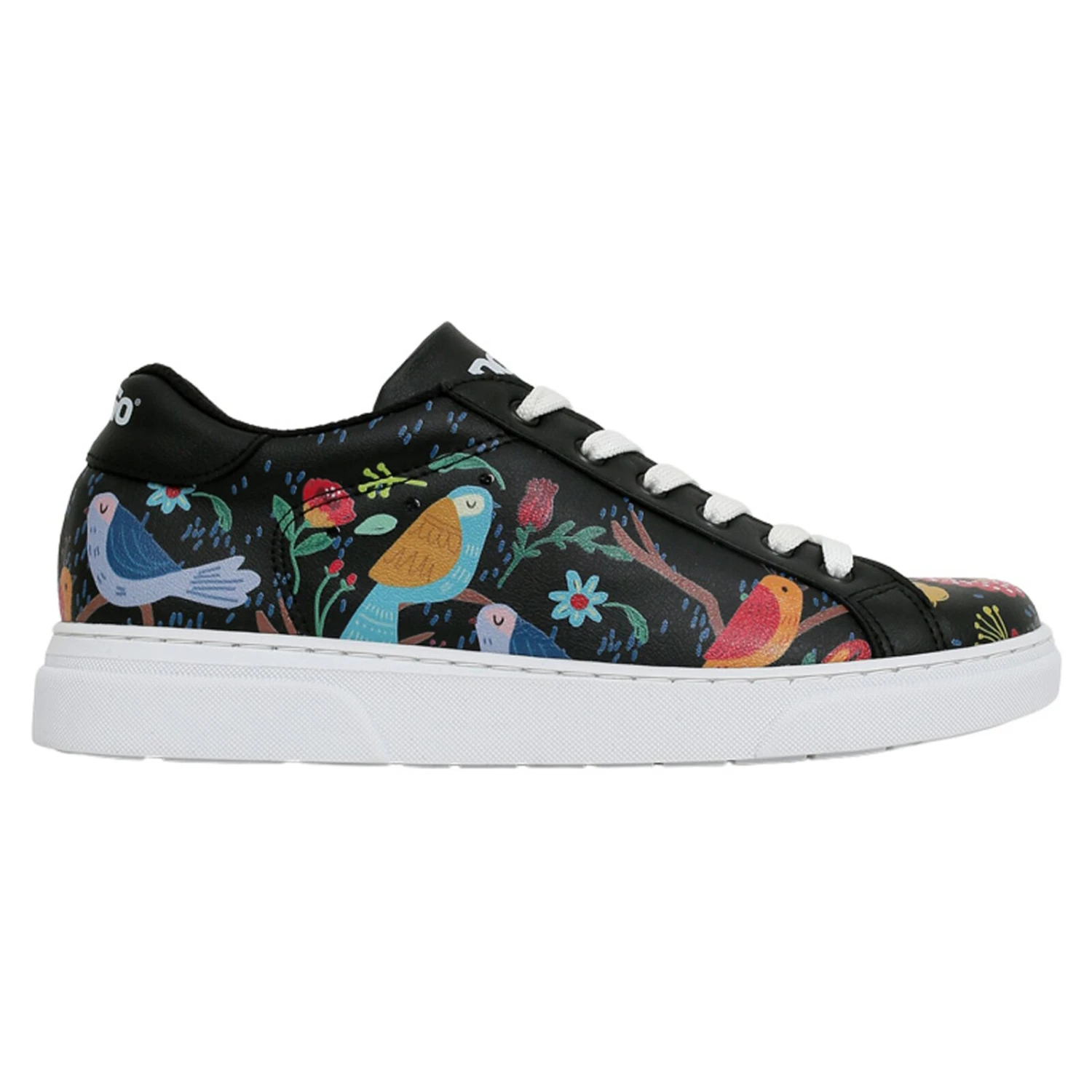 Die Black Edition der beliebten Ace Sneaker ist perfekt für alle, die es nicht ganz so clean, aber dennoch zeitlos und modern zugleich mögen. Ebenso wie die weiße Variante der Ace Sneaker garantiert auch die Black Edition hohen Tragekomfort und zahlreiche Kombinationsmöglichkeiten. Die weiße Sohle und die weißen Schnürsenkel schaffen einen gekonnten Kontrast zum Schwarz der Schuhoberfläche. Die einzigartigen Motive sind dezent auf den schwarzen veganen Sneakern platziert. So entsteht eine perfekte Balance aus Trend und Individualität. Das Design „Flowers & Birds“ zeigt eine farbenfrohe Frühlingsszene aus bunten Blumen und Vögeln, die zwar im Kontrast zur schwarzen Farbe der Ace Sneaker steht, aber genau auf diese Weise eine beinahe märchenhafte Atmosphäre schafft.