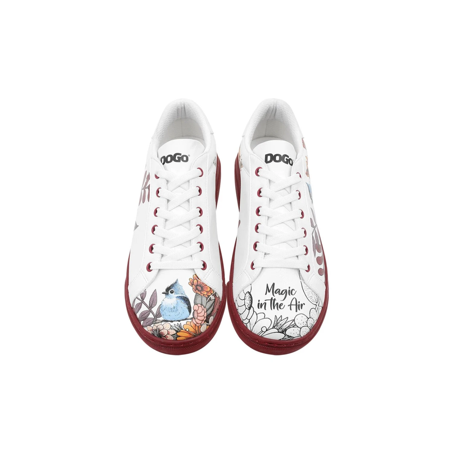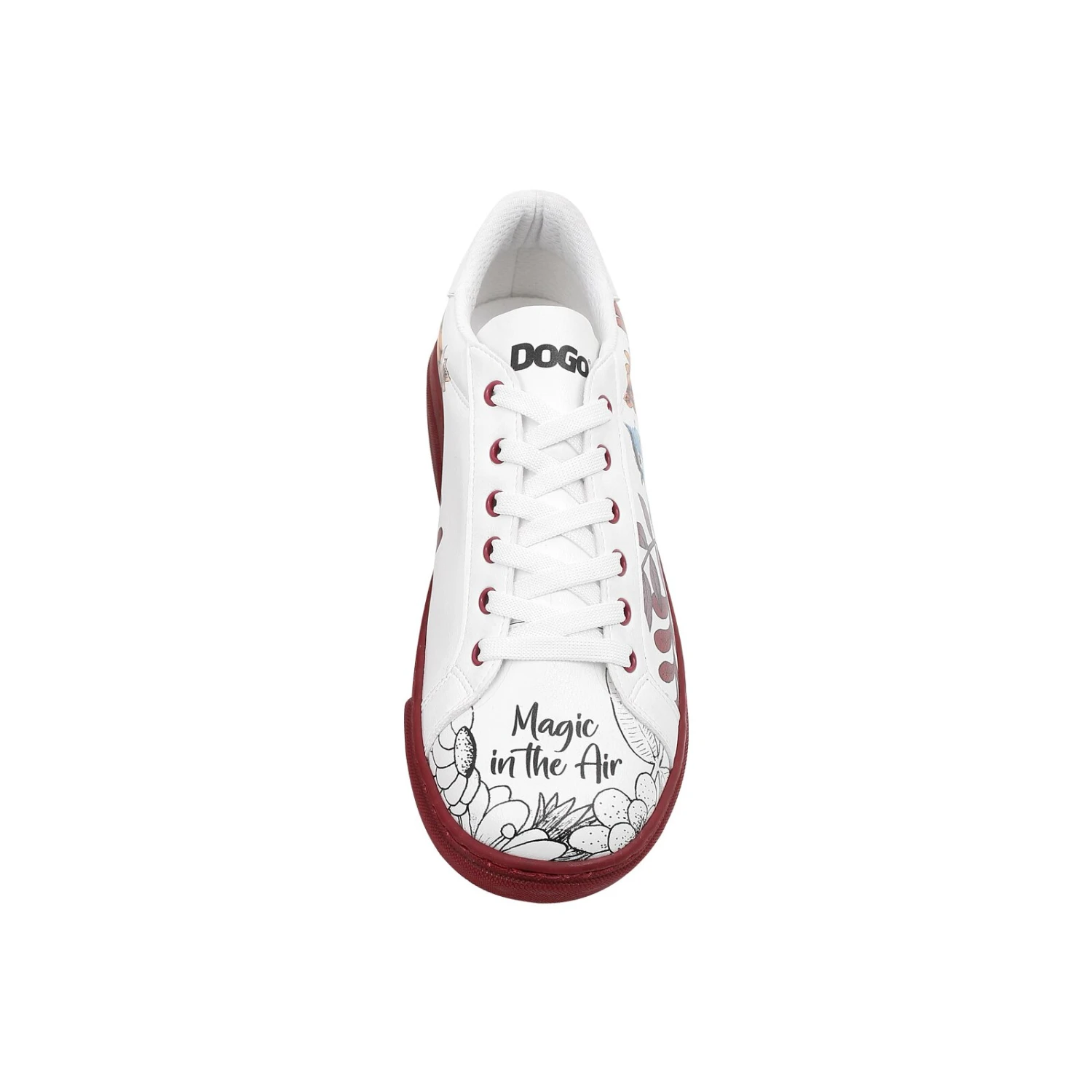 Einfach bezaubernd sind die Ace Sneaker im Design „Magic in the Air“. Das kleine blaue Vögelchen, umgeben von zarten Blüten und Blättern, kommt auf dem weißen Schuh ebenso toll zur Geltung wie die Aufschrift „Magic in the Air“. Ein zusätzlicher Eyecatcher ist außerdem die bordeauxrote Sohle, die das Motiv perfekt ergänzt. Die DOGO Ace Sneaker sind perfekt für alle, die es zeitlos und modern zugleich mögen. Sie garantieren hohen Tragekomfort und lassen sich vielseitig kombinieren. Die einzigartigen Motive sind dezent auf den weißen veganen Sneakern platziert. So entsteht eine perfekte Balance aus Trend und Individualität.
