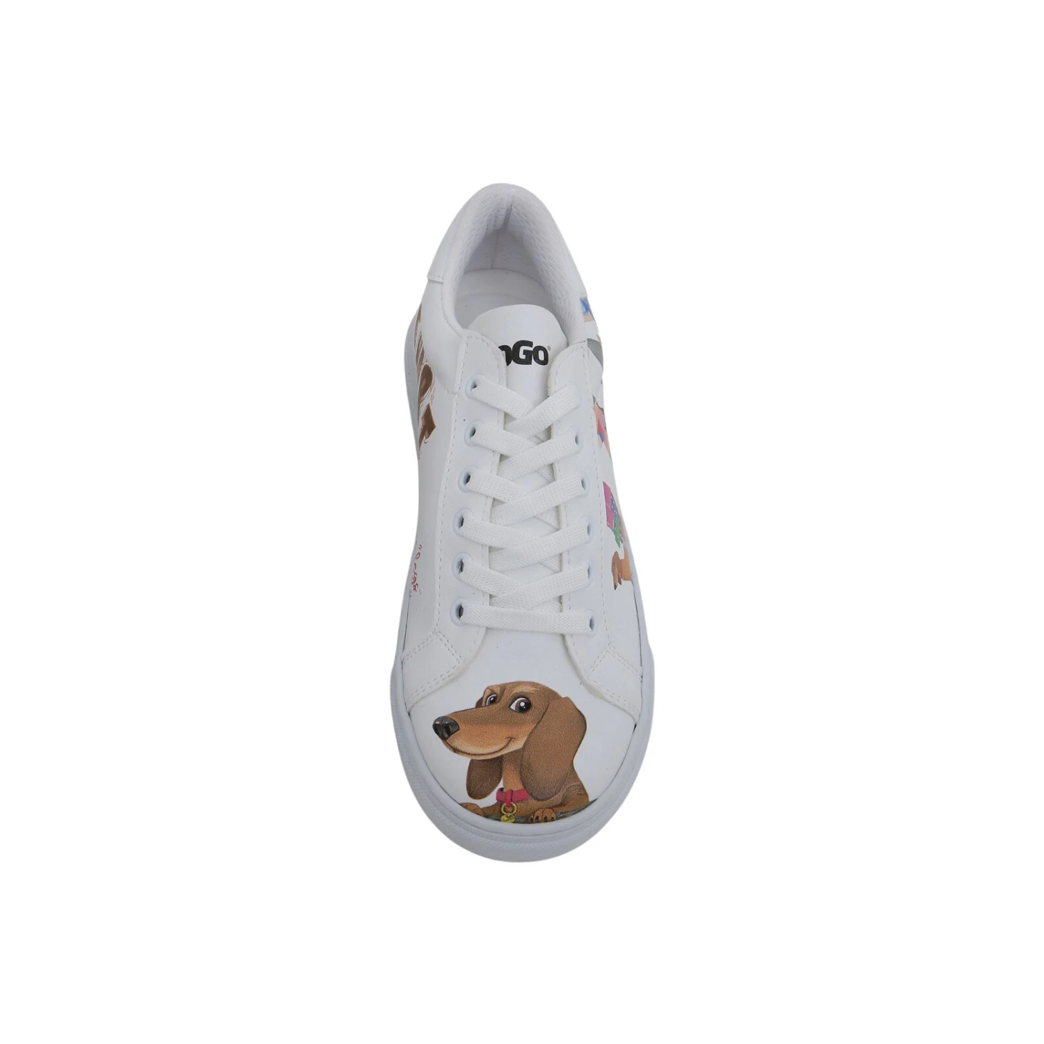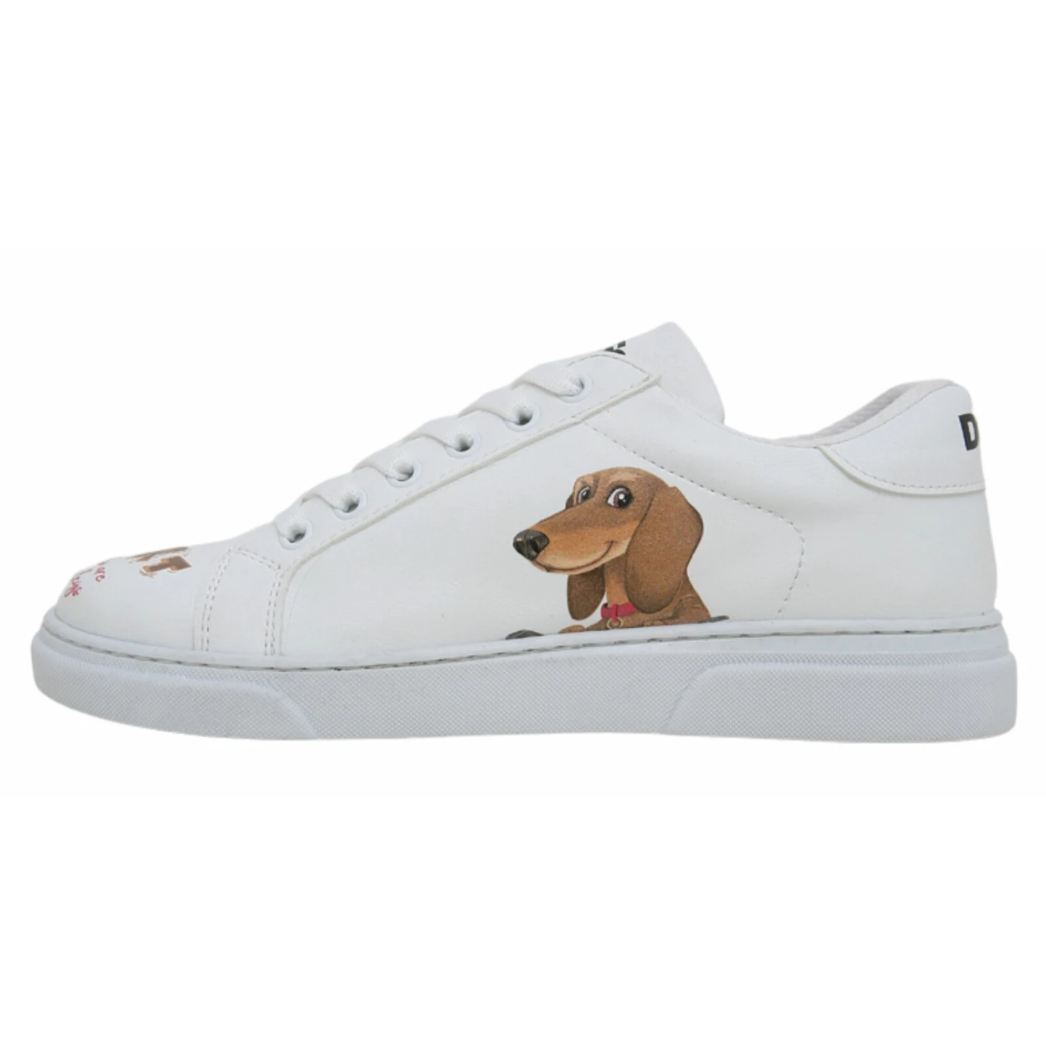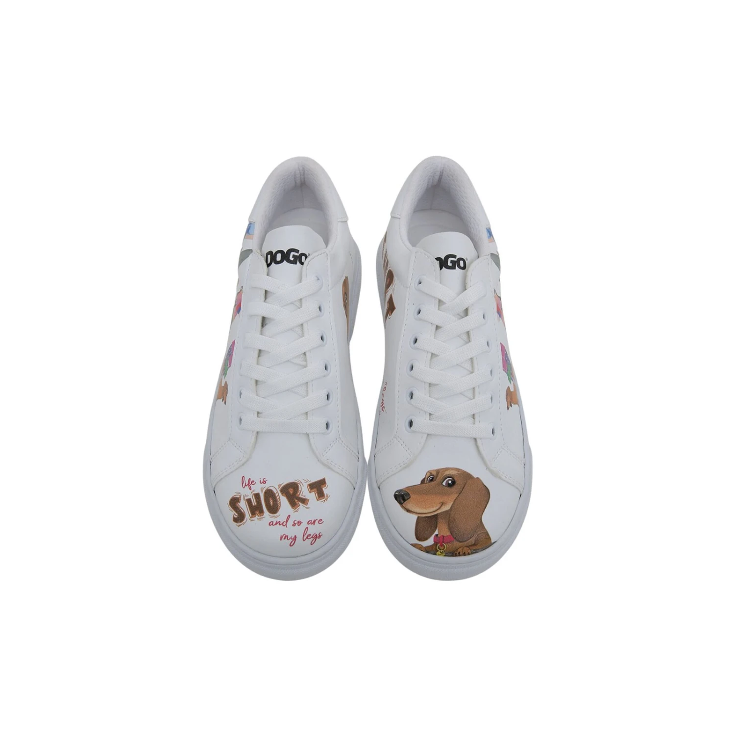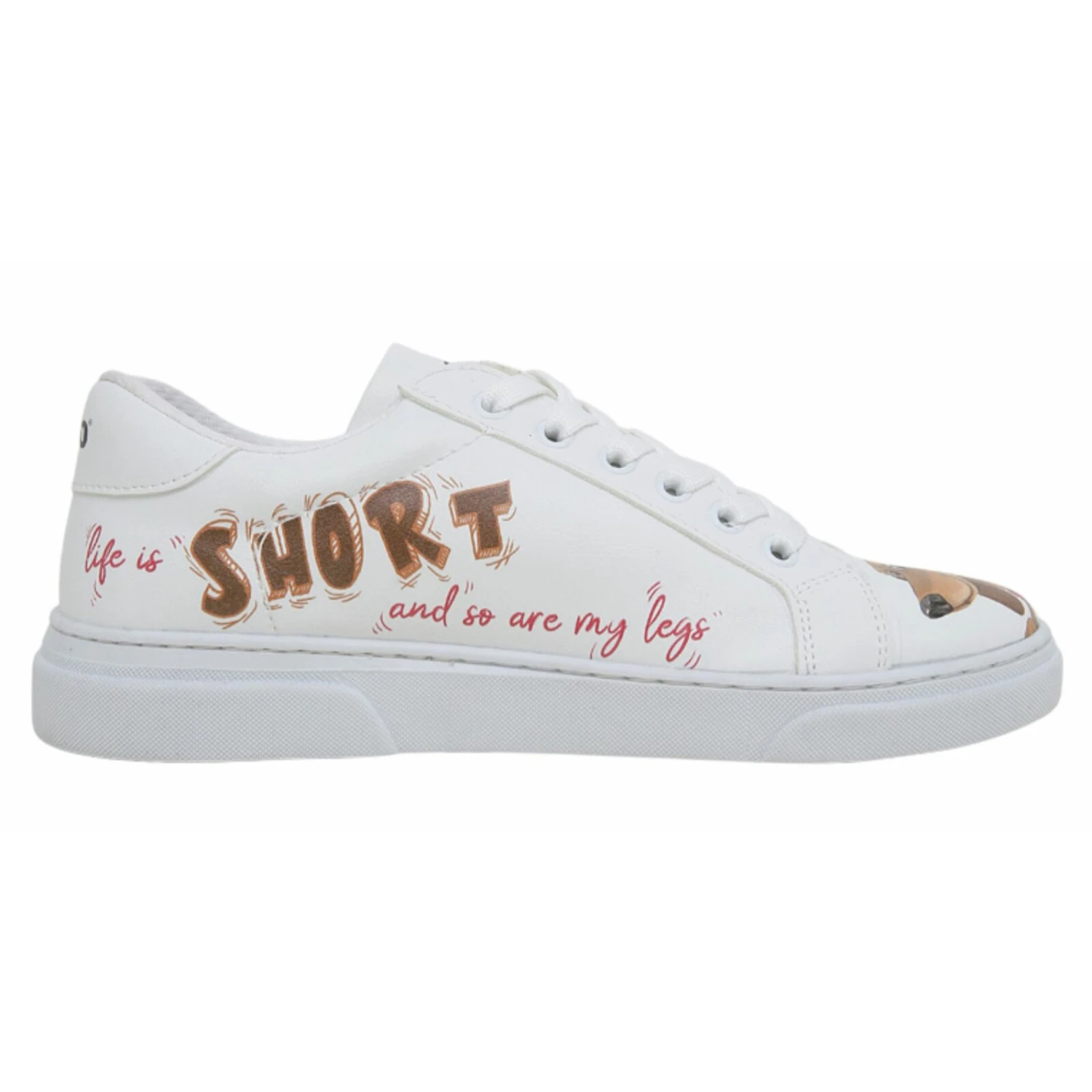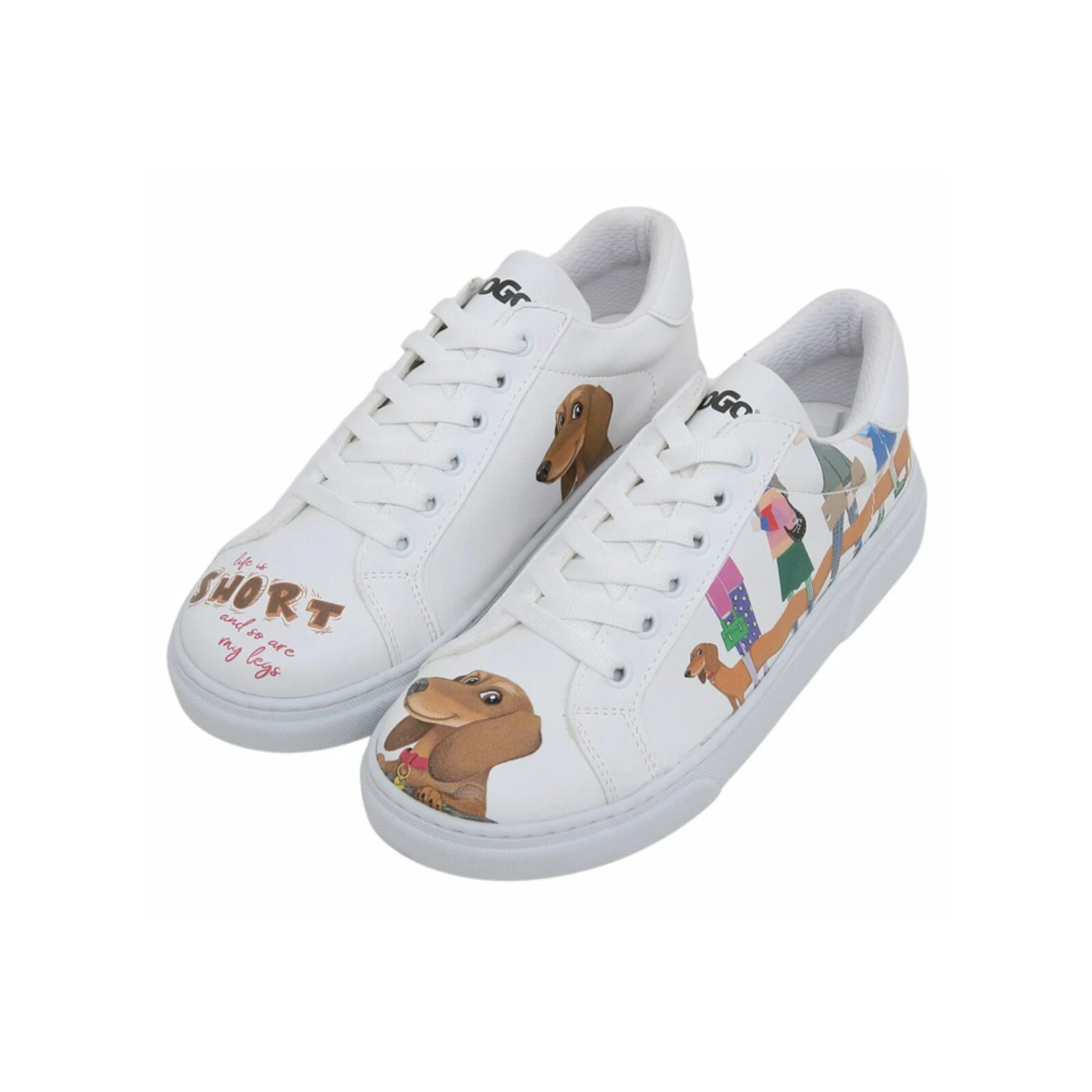 Auf einem frischen Weiß präsentieren sich charmante Dackelillustrationen, begleitet von der verspielten Botschaft „Life is short and so are my legs“. Diese Sneakers sind ein echter Hingucker und perfekt für alle Hundefreunde, die mit einem Augenzwinkern durchs Leben gehen möchten.