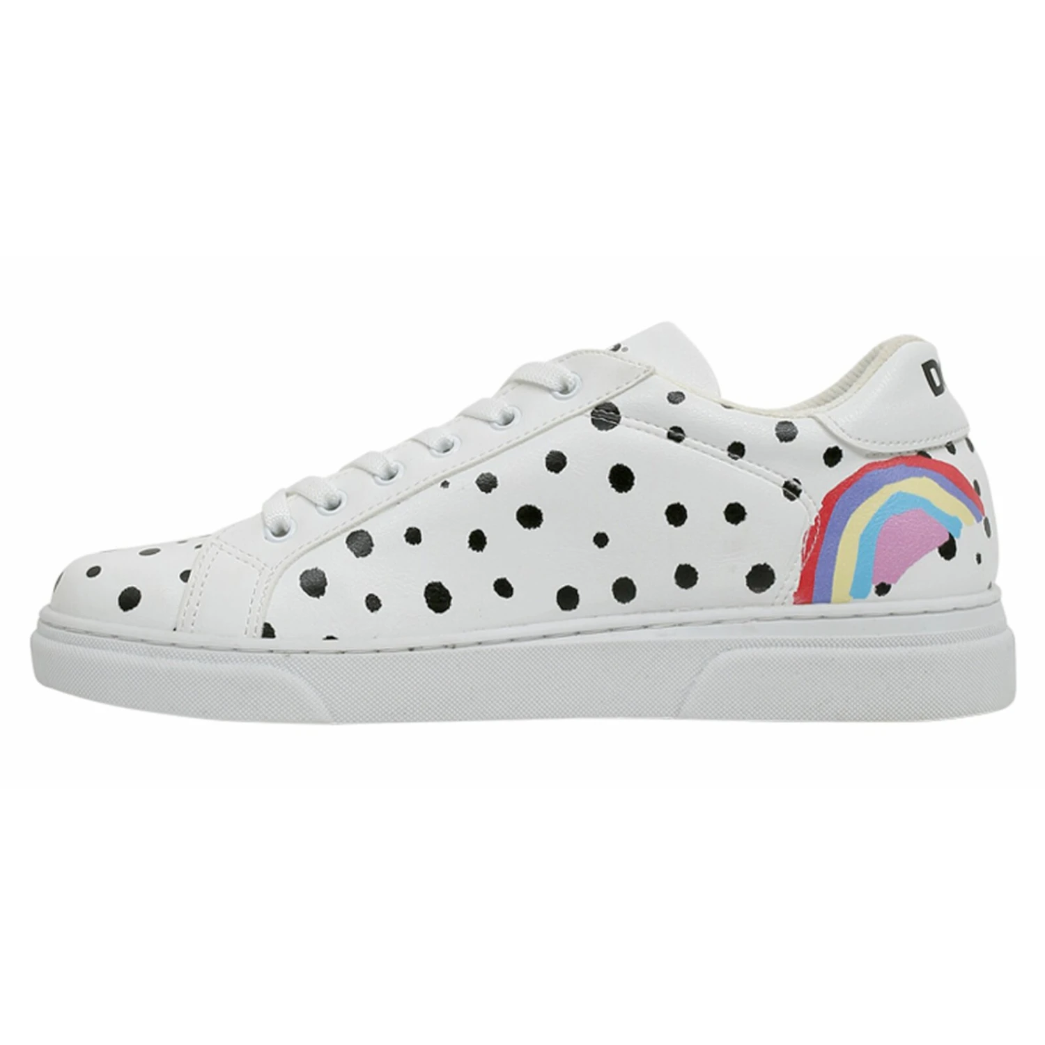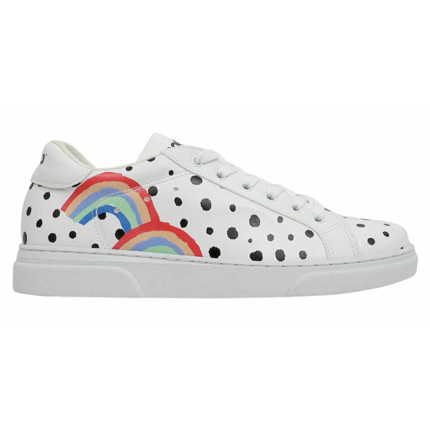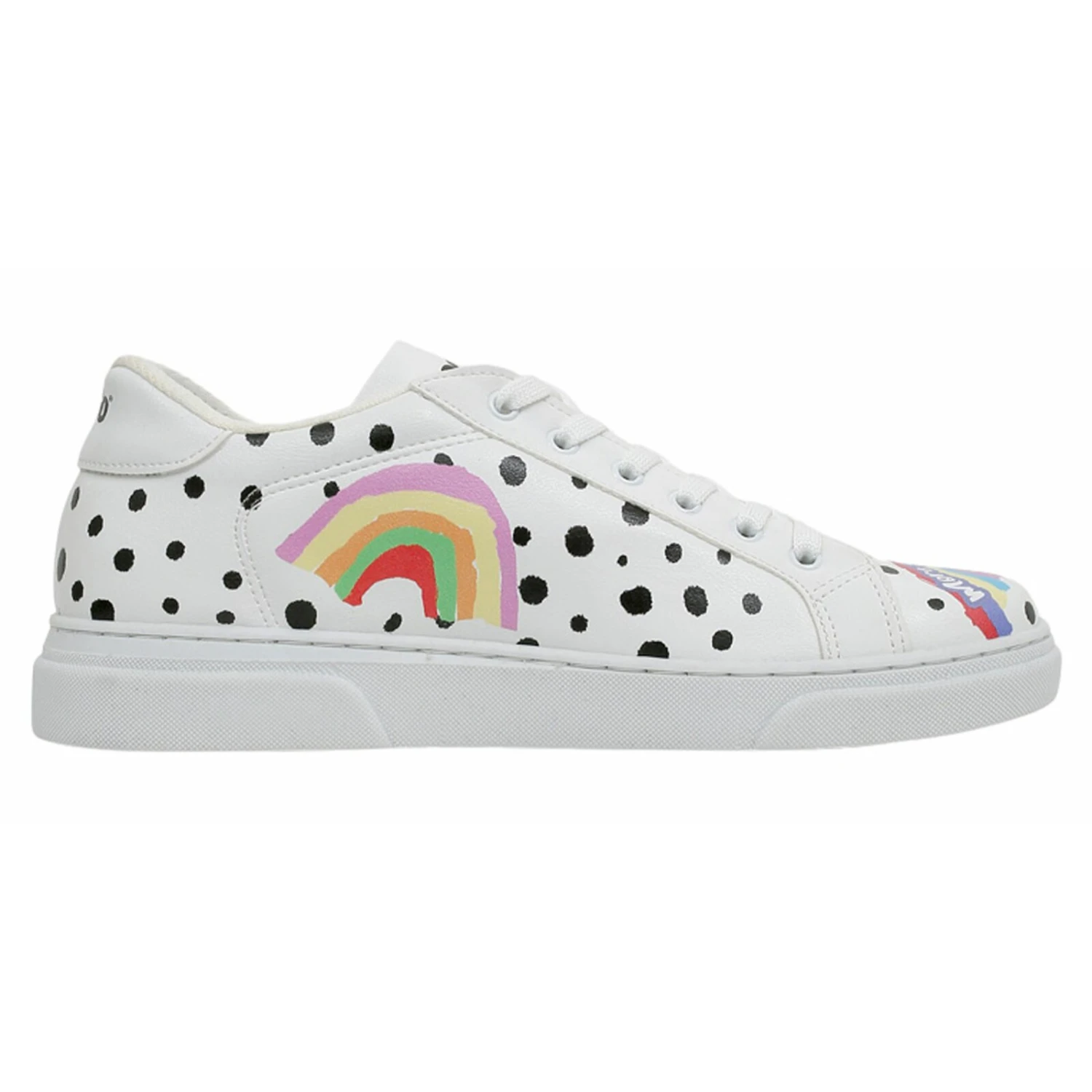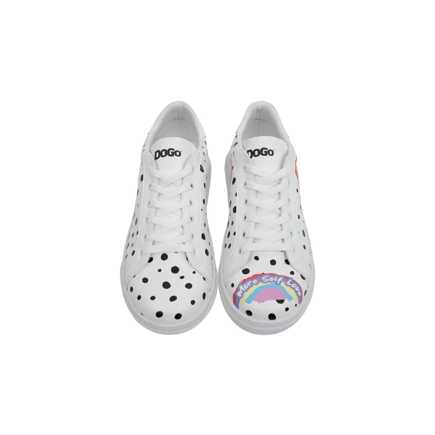 Das Design „More Self Love“ zeigt Regenbogen umgeben von dicken, schwarzen Punkten und den Spruch More Self Love. Damit ist dieser Sneaker wie gemacht für unseren Slogan „Personalize your life“, der ausdrücken soll, dass man das Leben nach seinen eigenen Vorstellungen und Träumen gestalten darf. Mutig und einzigartig sein darf und der Welt zeigen darf, wer man wirklich ist. Sich und sein Leben lieben darf.