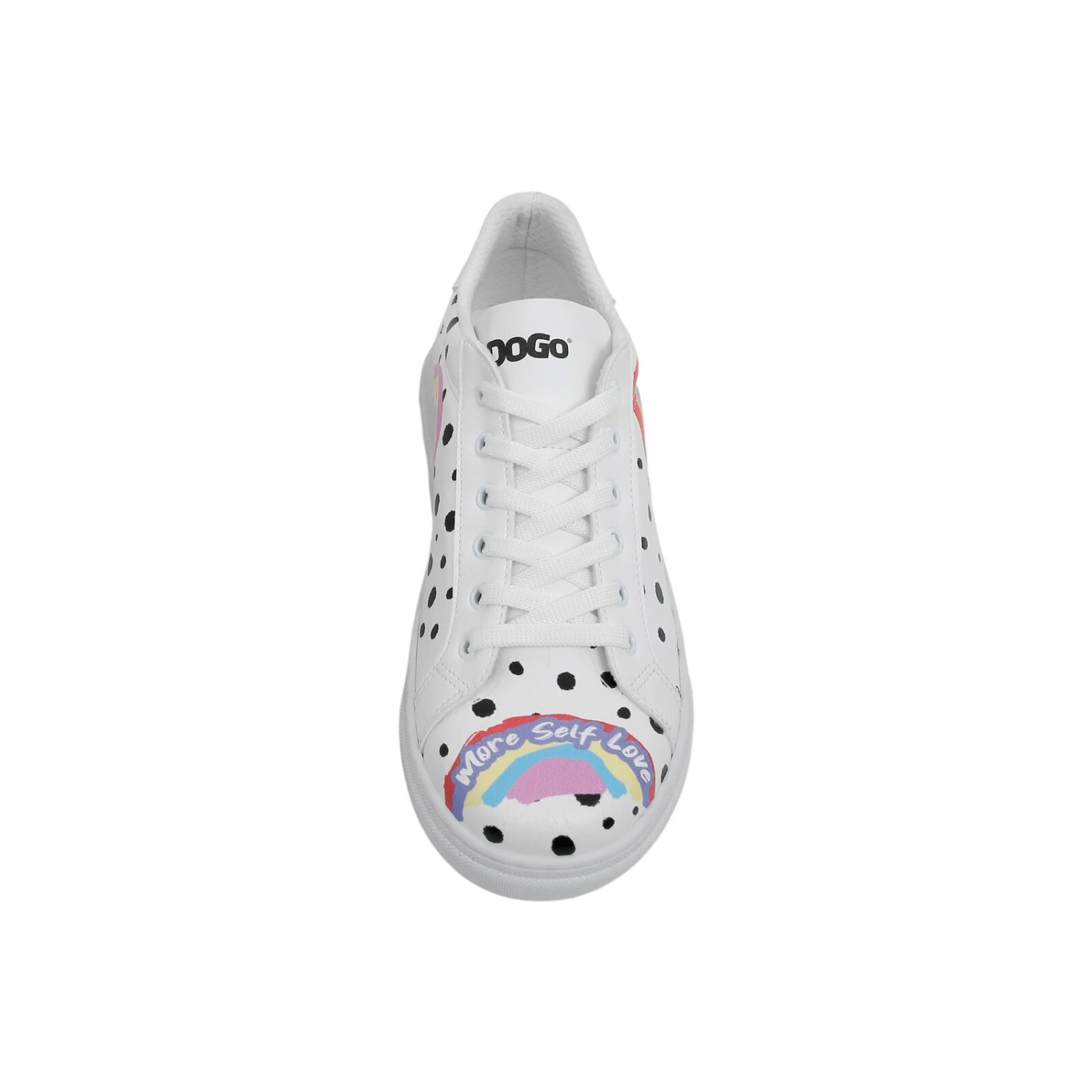Die DOGO Ace Sneaker sind der perfekte Schuh, wenn man es zeitlos und modern zugleich mag. Das Modell vereint jugendliche Frische und Leichtigkeit mit dem bekannten DOGO-Charme und schafft damit die perfekte Balance aus Trend und Individualität. Das gepolsterte Fußbett, die bequeme Passform und die 6-Loch-Schnürung sorgen für hohen Tragekomfort. Die einzigartigen Motive sind dezent auf den ansonsten weißen Ace Sneakern platziert, sodass sich die Sneaker vielseitig kombinieren lassen.