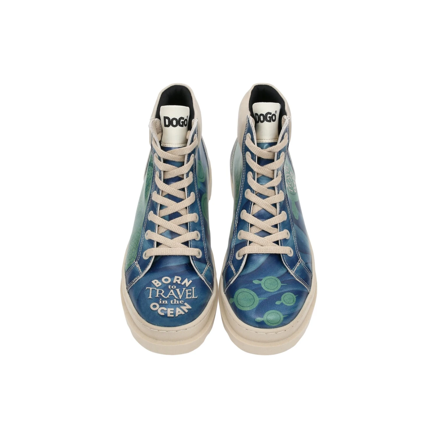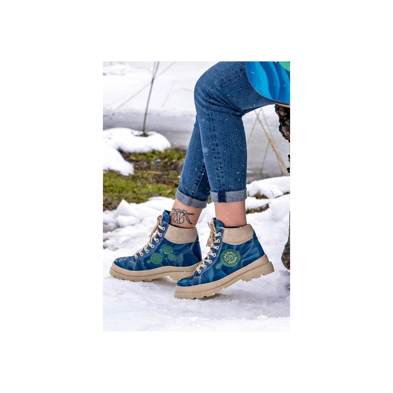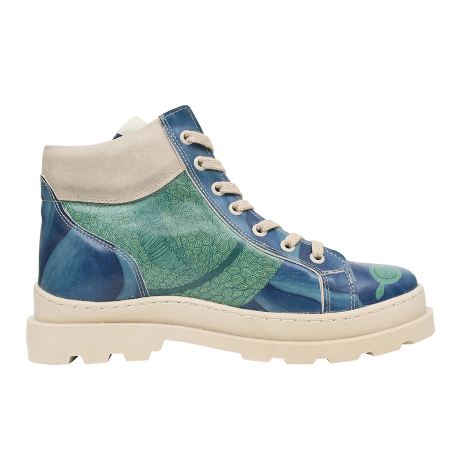 DOGO Adriana Boots sorgen durch ihre farbenfrohen Designs für gute Laune an grauen Herbst- und Wintertagen und liegen durch ihre angenehme Plateausohle voll im Trend. Mit diesen stylischen Stiefeletten für Damen werden Sie zur Trendsetterin, denn bunte Plateauboots sind derzeit ein modisches Must-have. Die DOGO Adriana Boots überzeugen auch in Sachen Tragekomfort auf ganzer Linie. Das weich gepolsterte Plateau lässt Sie fünf Zentimeter über dem Boden schweben, der neun Zentimeter hohe und zusätzlich gepolsterte Schaft sorgt für Halt an den Knöcheln und wärmt an kälteren Tagen. Eine Neun-Loch-Schnürung ermöglicht die individuelle Anpassung des Boots an Ihren Fuß. Durch die weit geschnittene Passform können diese Damenboots auch perfekt mit orthopädischen Einlagen getragen werden. Das Design „Born To Travel In The Ocean“ stillt auch im Winter ihr Meerweh und lädt mit den minimalistisch gezeichneten Schildkröten dazu ein, die Ozeane zu erkunden. Die weiße Sohle und die weißen Schnürsenkel bilden einen interessanten Kontrast zum kräftigen Blau der Damenboots.