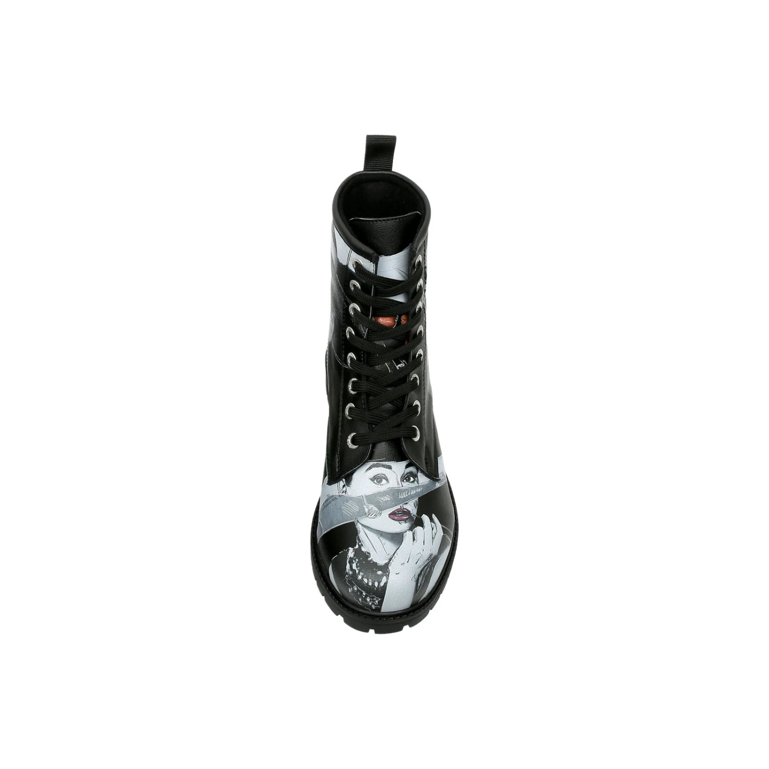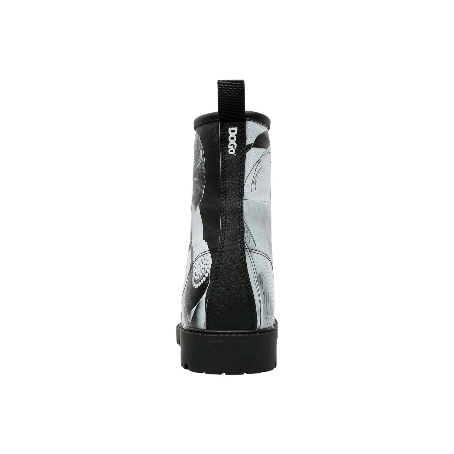 Diese unvergleichlich schicken Boots sind dem auch mehr als 50 Jahre nach seinem Erscheinen immer noch absolut sehenswerten Filmklassiker Breakfast at Tiffany’s gewidmet. Dieser Film machte die Schauspielerin Audrey Hepburn unsterblich, die darin die Hauptrolle der lebhaften New Yorkerin Holly Golightly spielte. Unvergesslich sind die Bilder, auf denen die schöne junge Frau mit ihrer Zigarettenspitze in der Hand zu sehen ist oder auf denen sie im schwarzen Cocktailkleid vor einem edlen Juweliergeschäft ihr Frühstück verspeist. Mit ihrem vornehmlich in Schwarz-Weiß gehaltenem Design erinnern die eleganten Boots an diese weltberühmten Filmszenen. Und auch der rote Mantel, in dem Holly einen elegant gekleideten jungen Mann küsst und der große schwarze Hut, unter dem sie kess hervorschaut, sind auf den Damenschuhen zu sehen. Diese DOGO Boots sehen mit ihren schicken Prints einfach so einzigartig und stylisch aus, dass die Menschen auf der Straße sich allesamt gern noch einmal nach Ihnen umdrehen werden. Damit verleihen Sie Ihrem Look ganz schnell und einfach eine individuelle, aufregende und moderne Note.