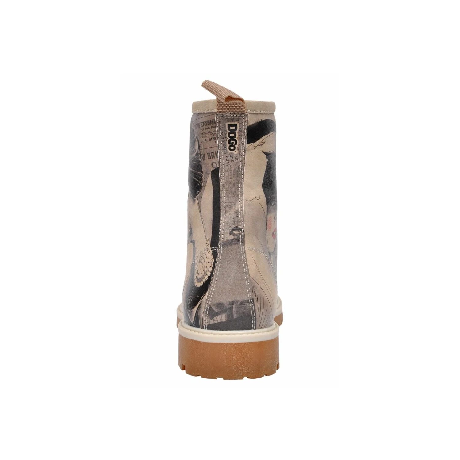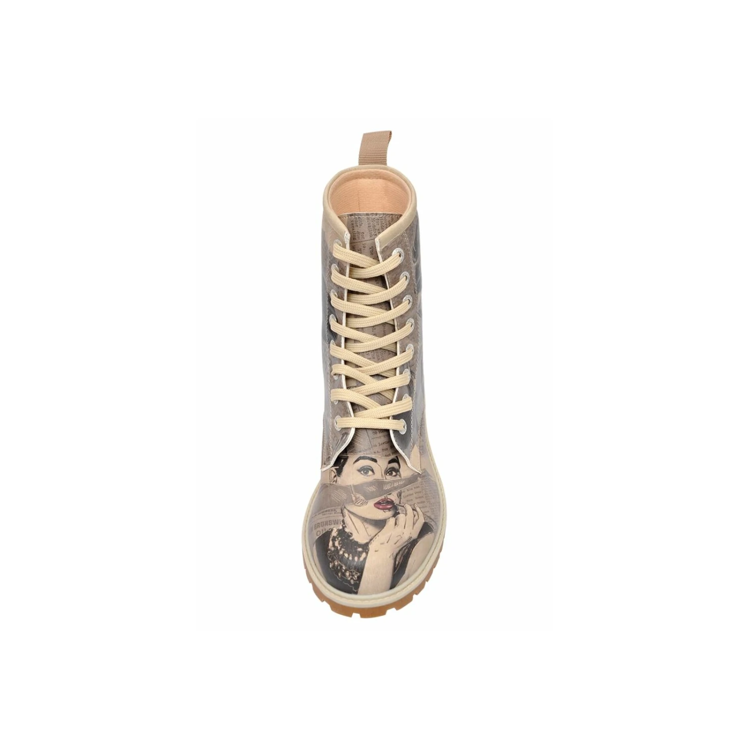 Diese unvergleichlich schicken Boots sind dem auch mehr als 50 Jahre nach seinem Erscheinen immer noch absolut sehenswerten Filmklassiker Breakfast at Tiffany’s gewidmet. Dieser Film machte die Schauspielerin Audrey Hepburn unsterblich, die darin die Hauptrolle der lebhaften New Yorkerin Holly Golightly spielte. Unvergesslich sind die Bilder, auf denen die schöne junge Frau mit ihrer Zigarettenspitze in der Hand zu sehen ist oder auf denen sie im schwarzen Cocktailkleid vor einem edlen Juweliergeschäft ihr Frühstück verspeist. Mit ihrem vornehmlich in Schwarz-Weiß gehaltenem Design erinnern die eleganten Boots an diese weltberühmten Filmszenen. Und auch der rote Mantel, in dem Holly einen elegant gekleideten jungen Mann küsst und der große schwarze Hut, unter dem sie kess hervorschaut, sind auf den Damenschuhen zu sehen. Diese DOGO Boots sehen mit ihren schicken Prints einfach so einzigartig und stylisch aus, dass die Menschen auf der Straße sich allesamt gern noch einmal nach Ihnen umdrehen werden. Damit verleihen Sie Ihrem Look ganz schnell und einfach eine individuelle, aufregende und moderne Note.