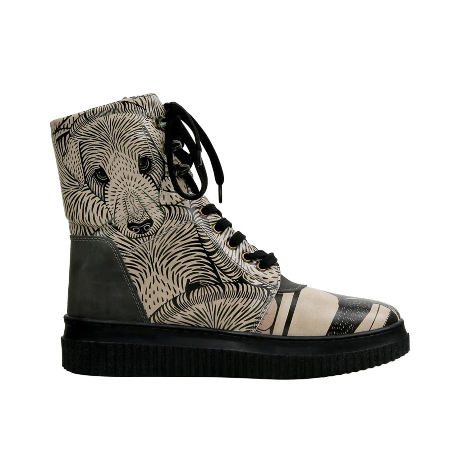 DOGOs in ganz neuer Form: Das sind die neuen Future Boots der veganen Schuhmarke. Die Grundform erinnert an einen hoch geschnittenen Sneaker, der Ihren Fuß an kühlen Herbsttagen warmhält. Mit diesem lässigen Sneakerboot sind Sie im Herbst perfekt gekleidet. Ein besonderes Merkmal dieser Boots ist, dass sich einzelne Teile des Motivs durch die Verarbeitung eines hochwertigen Kunstleders vom rechtlichen Design absetzten. Die neuen Boots zeichnet ihr sportlich-schickes Design und ihre hochwertige Verarbeitung aus. Ihre Füße werden sich in diesen Schuhen einfach wohlfühlen. Dazu trägt die neue und komfortable Polsterung am oberen Rand des Stiefelschafts bei. Geschlossen werden die Boots mit einer hübschen Fünf-Loch-Schnürung und drei Schnürhäkchen im oberen Teil des Sneakerboots. Die Schnürhäckchen ermöglichen eine individuelle Anpassung des DOGO Boots an Ihr Bein und erleichtern das An- und Ausziehen der Schuhe. Auch bei den Future Boots setzt DOGO ausschließlich auf vegane Materialien.
