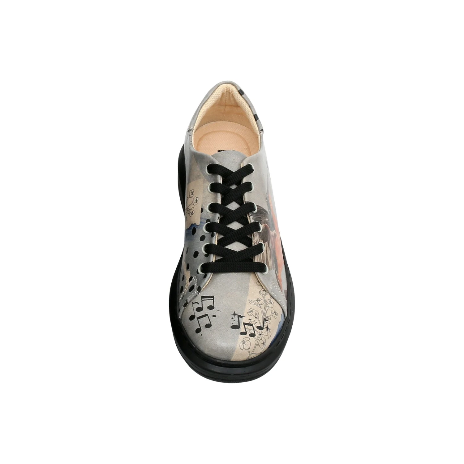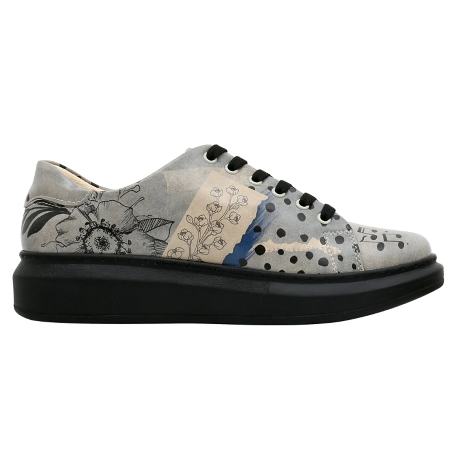 Sportlich und stylisch präsentiert sich das DOGO Modell Myra im Design „Birds Chirping“. Der Schuh mit Vogelmotiv und Noten auf schlichtem, grauem Untergrund bringt echte Frühlingsgefühle zu Ihnen nach Hause. Das angesagte Sneaker-Modell ist vor allem aufgrund der rund 4 cm hohen Plateau-Sohle so beliebt. Sie ermöglicht Ihnen hohen Tragekomfort und das bestmögliche Laufgefühl, ohne dass Sie auf den einzigartigen DOGO Look verzichten müssen. Außerdem tragen die weich gepolsterte Sohle und die praktische 6-Loch-Schnürung dazu bei, dass Sie diesen Schuh am liebten jeden Tag tragen möchten.