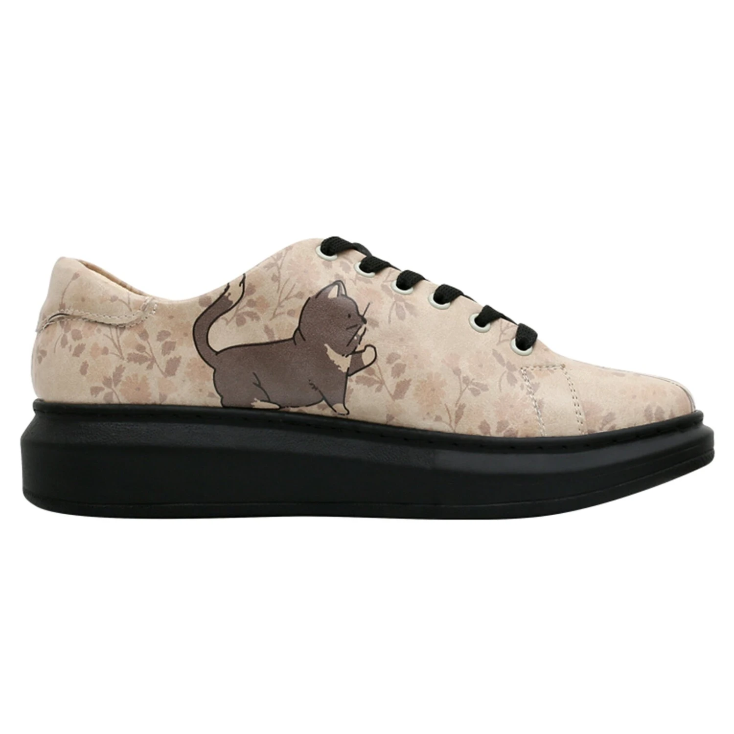 Sportlicher Look, angesagte Plateau-Sohle und niedliches Katzenmotiv in einem Schuh vereint? Unser neuer Myra Sneaker „Trouble Makers“ beweist, dass das möglich ist. Der lässige Sneaker besticht mit einer rund 4 cm hohen Plateau-Sohle, die Ihnen das bestmögliche Trage- und Laufgefühl bescheren wird. Durch die praktische 6-Loch-Schnürung können Sie den Schuh perfekt an Ihren Fuß anpassen. Wie alle DOGO Schuhe, werden auch diese Sneaker ausschließlich aus hochwertigen veganen Materialien gefertigt. Besonders ist an diesem Schuh allerdings das niedliche Katzenmotiv, das die Herzen aller Cat Moms höherschlagen lässt. Der Schriftzug „Don’t mess with us“, der die rechte Schuhkappe ziert, verrät, dass es selbst die niedlichsten Fellnasen faustdick hinter den Ohren haben.
