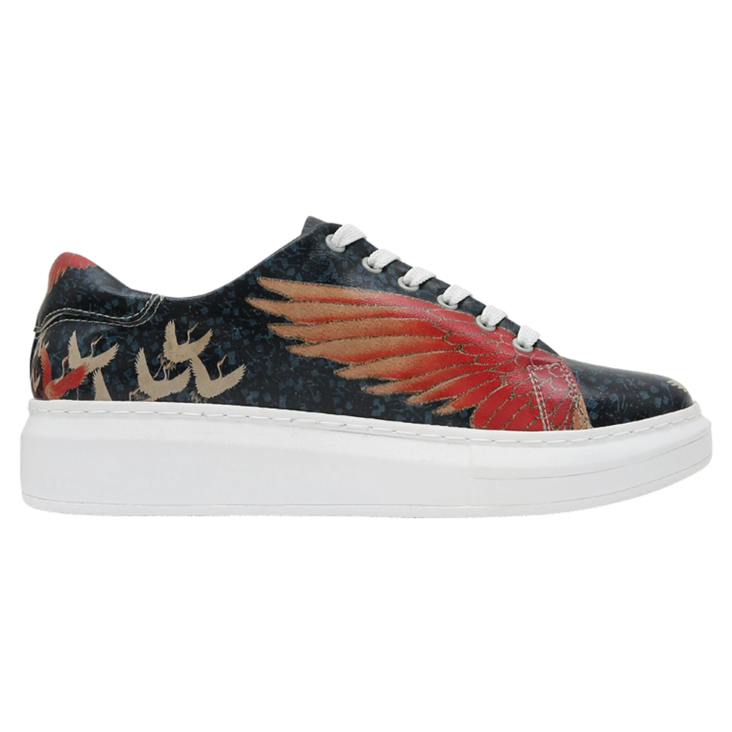 Sportlich und stylisch präsentiert sich das neue DOGO-Modell Myra in vielen verschiedenen Designs. Durch die vier Zentimeter hohe Sohle wird ein aktueller Trend aufgegriffen, der aus der Modewelt nicht mehr wegzudenken ist: Plateau. Mit diesem Schuh heben sie sich sprichwörtlich von der Masse ab. Das neue Modell wird mit den für DOGO spezifischen Mustern und Designs abgerundet. Trotz der Plateausohle wirkt das Modell Myra keineswegs klobig am Fuß. Tragekomfort wird hier ganz großgeschrieben, denn Innen ist eine neue angenehm weiche Sohle verarbeitet worden, damit sich Ihre Füße den ganzen Tag in den DOGO Schuhen wohlfühlen. Eine Acht-Loch-Schnürung sorgt für den nötigen Halt am Fuß. Auch bei diesem Trend-Sneaker setzt DOGO ausschließlich auf vegane Materialien und beste Qualität.
