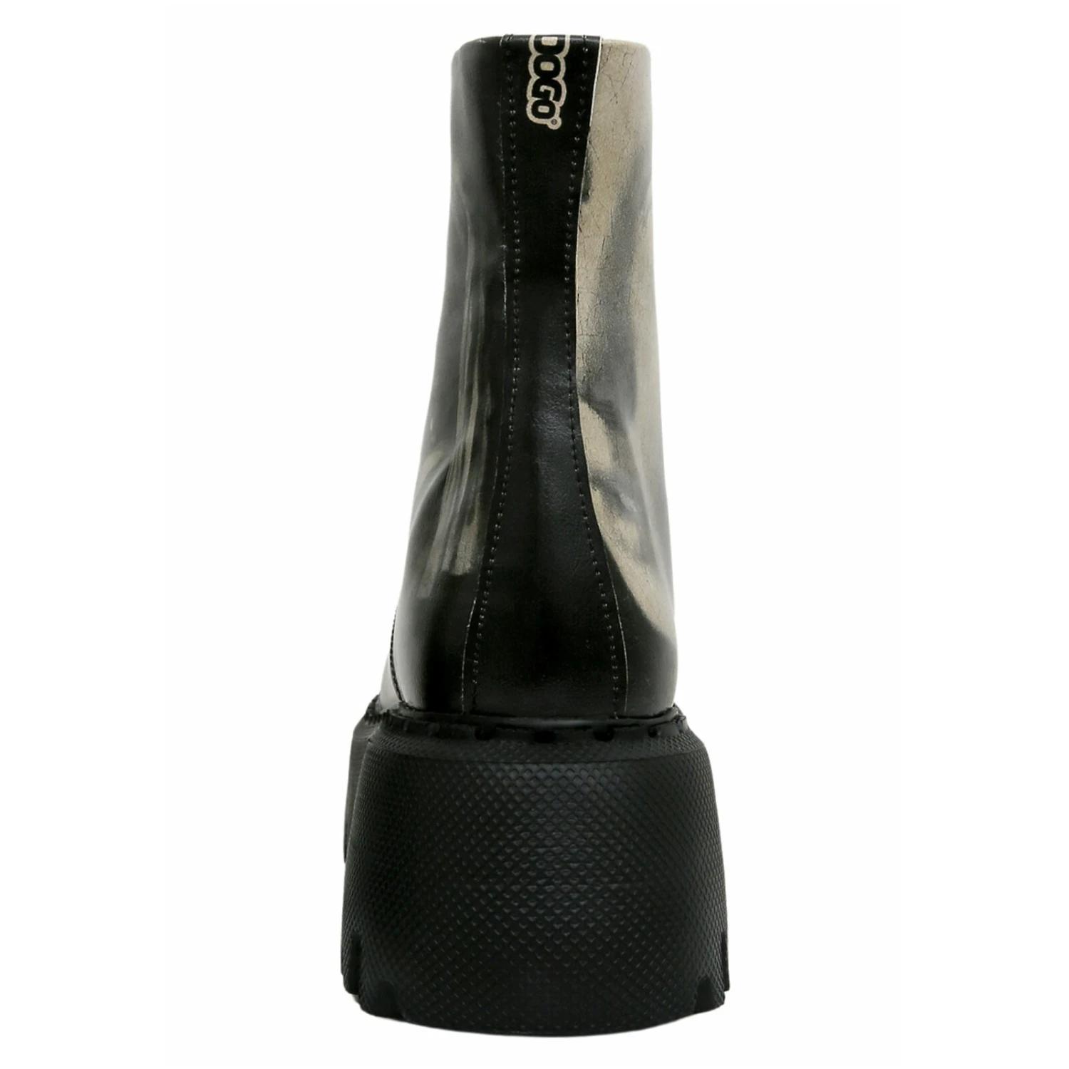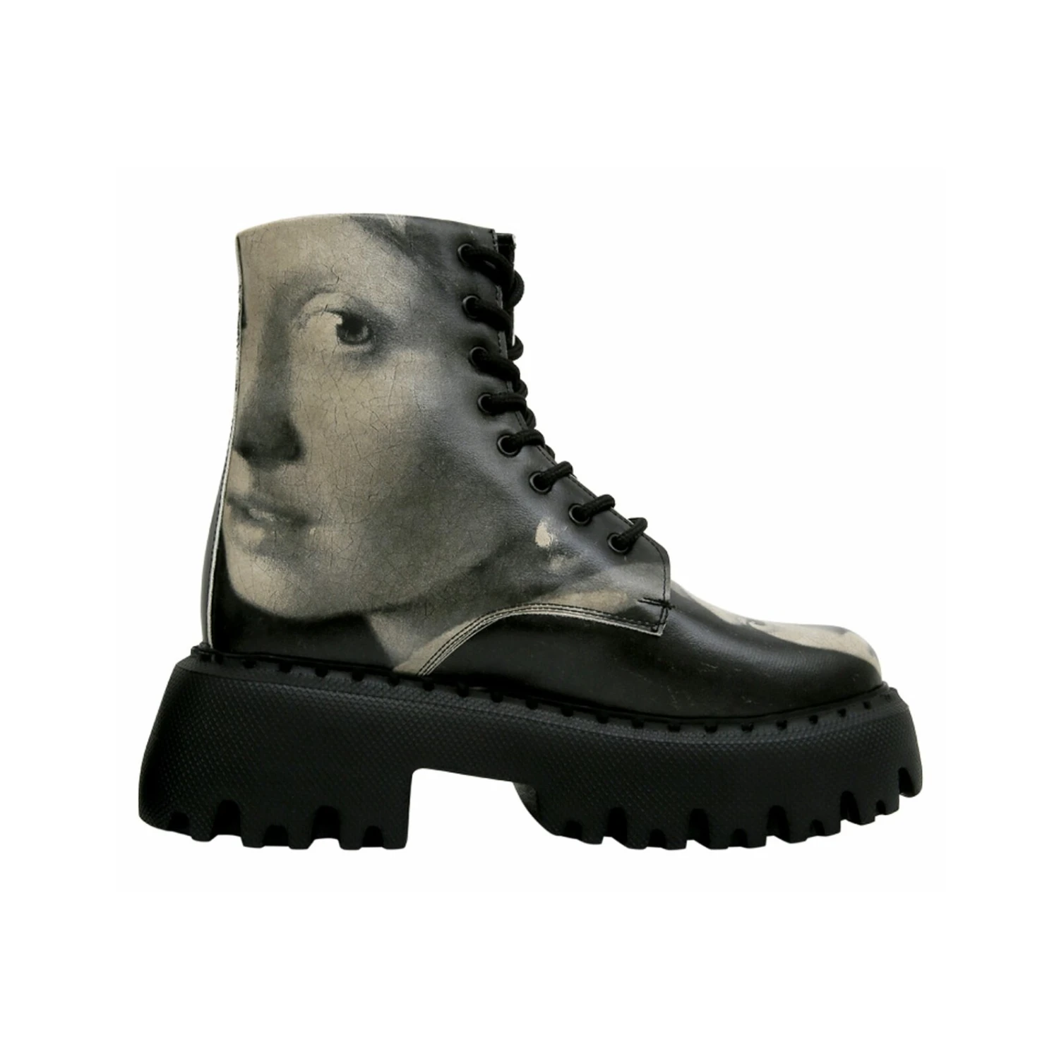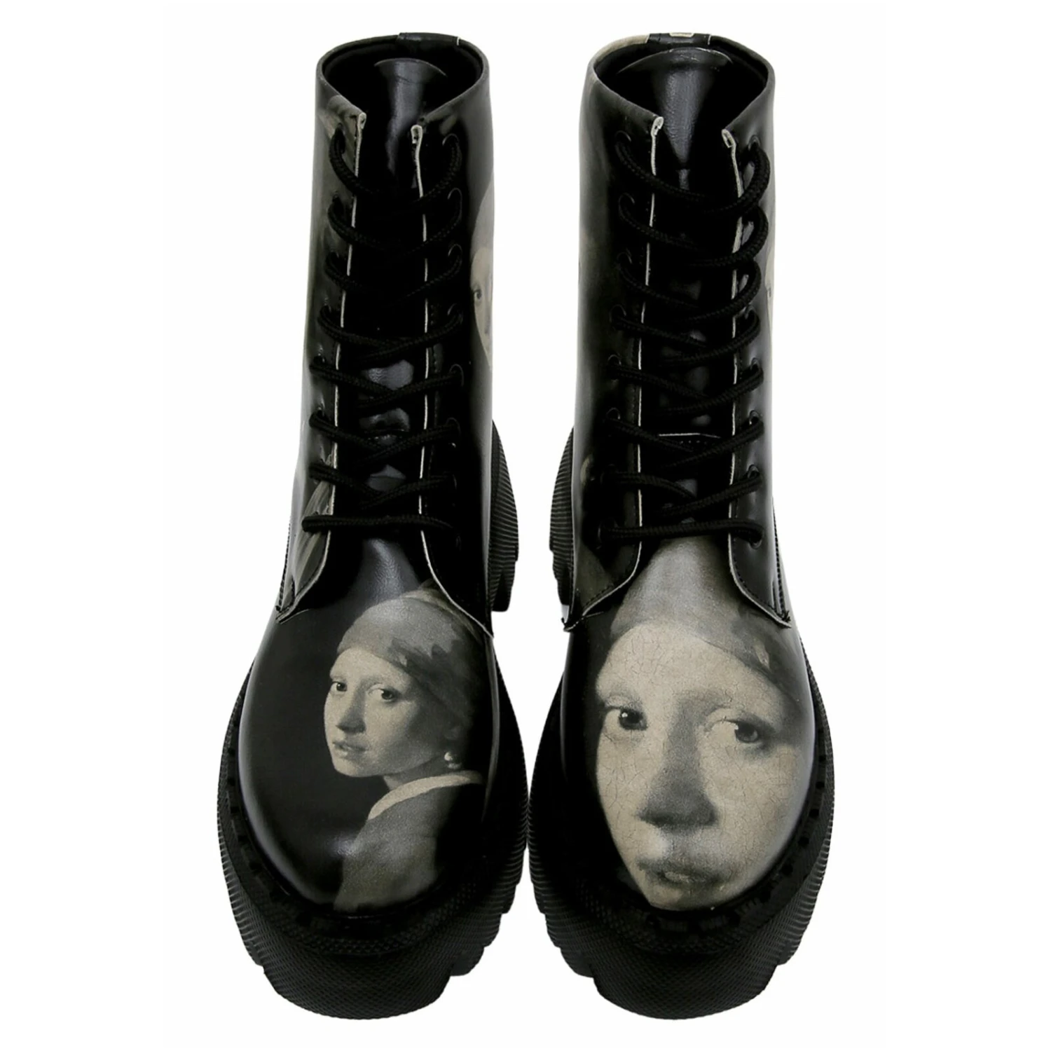 Die neuen DOGO Navy treffen genau den Nerv der Zeit. Mit ihrer robusten Optik und der auffälligen Plateausohle erinnern sie an angesagte Combat-Boots. Diese einzigartigen Boots verfügen über einen ca. 15cm hohen Schaft und eine 8-Loch-Schnürung. Das Highlight bilden jedoch die Plateausohle und die außergewöhnlichen Prints. Das Design „Girl With A Pearl Earring“ zeigt das berühmte Gemälde von Jan Vermeer in Schwarz-Weiß. Somit werden in diesen DOGO Navy Boots gekonnt Mode und Kunst miteinander vereint.