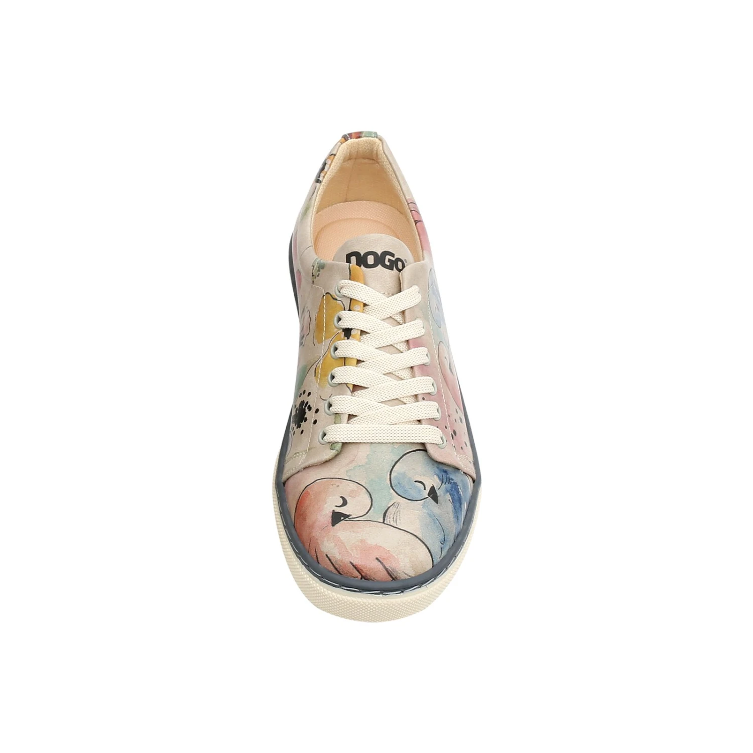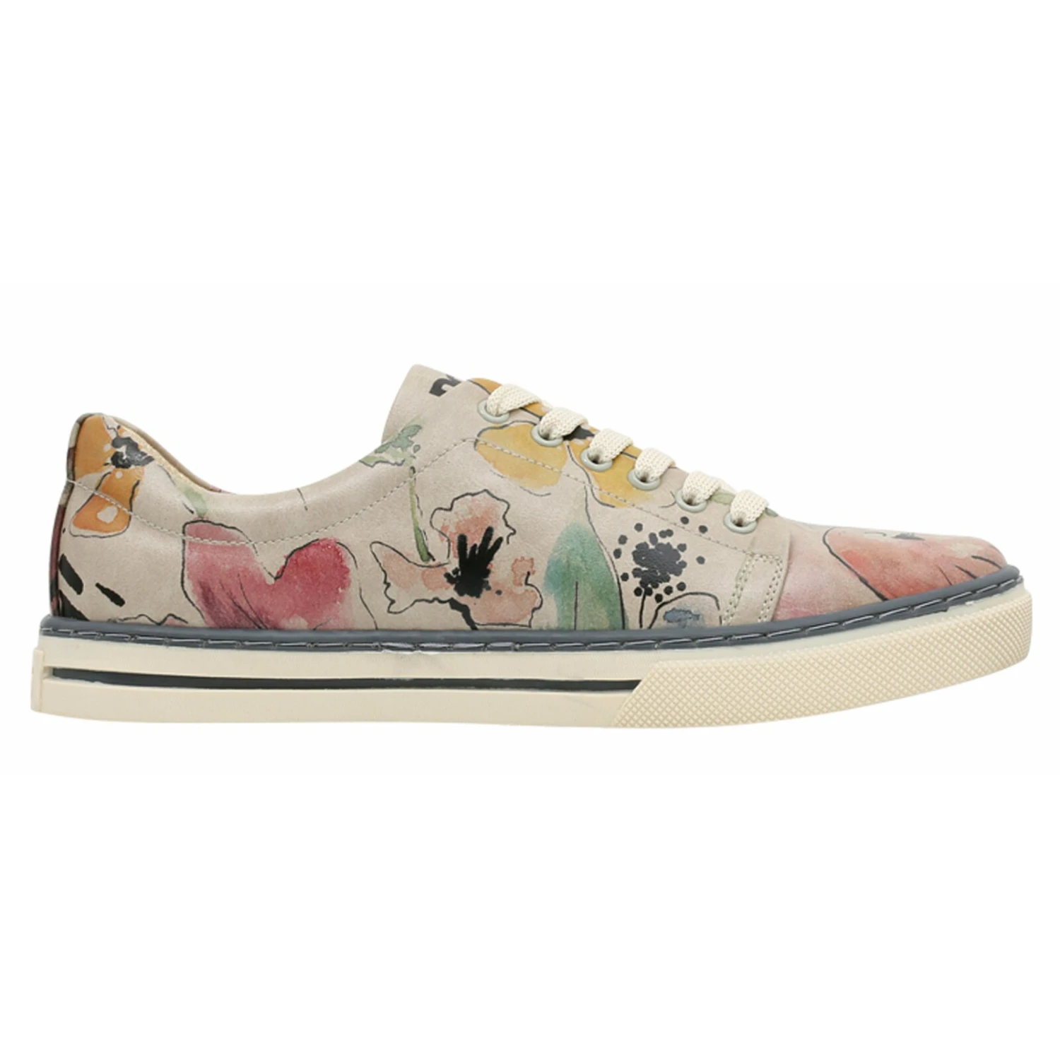 Der DOGO Classic Sneaker ist der perfekte Schuh für den Alltag. Sein zeitloser, klassischer Look mit profilierter, genähter Gummisohle und schwarzen Details macht ihn zu einem Schuh, der in Ihrem Schuhschrank keineswegs fehlen sollte. Dieses einzigartige Design „A Pair of Doves“ besticht außerdem durch den außergewöhnlichen, lebensbejahenden Aufdruck, der in den schönsten Farben daherkommt. Während der rechte Schuh von einem wunderschönen floralen Motiv geschmückt wird, zeigt der linke Schuh ein niedliches Taubenpaar, das in schönen Rot- und Blautönen strahlt. Mit diesem ungewöhnlichen Look werden Sie sicher alle Augen auf sich ziehen. In puncto Material können Sie auch von diesem Lace-up-Schnürer hochwertiges veganes Kunstleder und angenehmes Baumwollfutter erwarten.